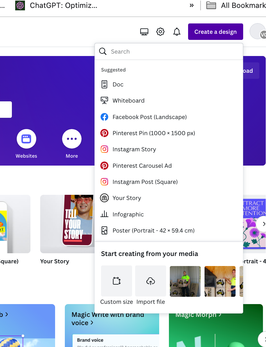 On the right corner of Canva’s dashboard, you will find the feature: ‘Create a New Design’. If you click on it and scroll down, you will get the option: Pinterest Pin. One of the coolest things about Canva is that it frequently updates the design sizes. So, creating pins as per Pinterest’s recommended size won’t be a hassle. Creating a custom design is also possible by adding your preferred sizes.