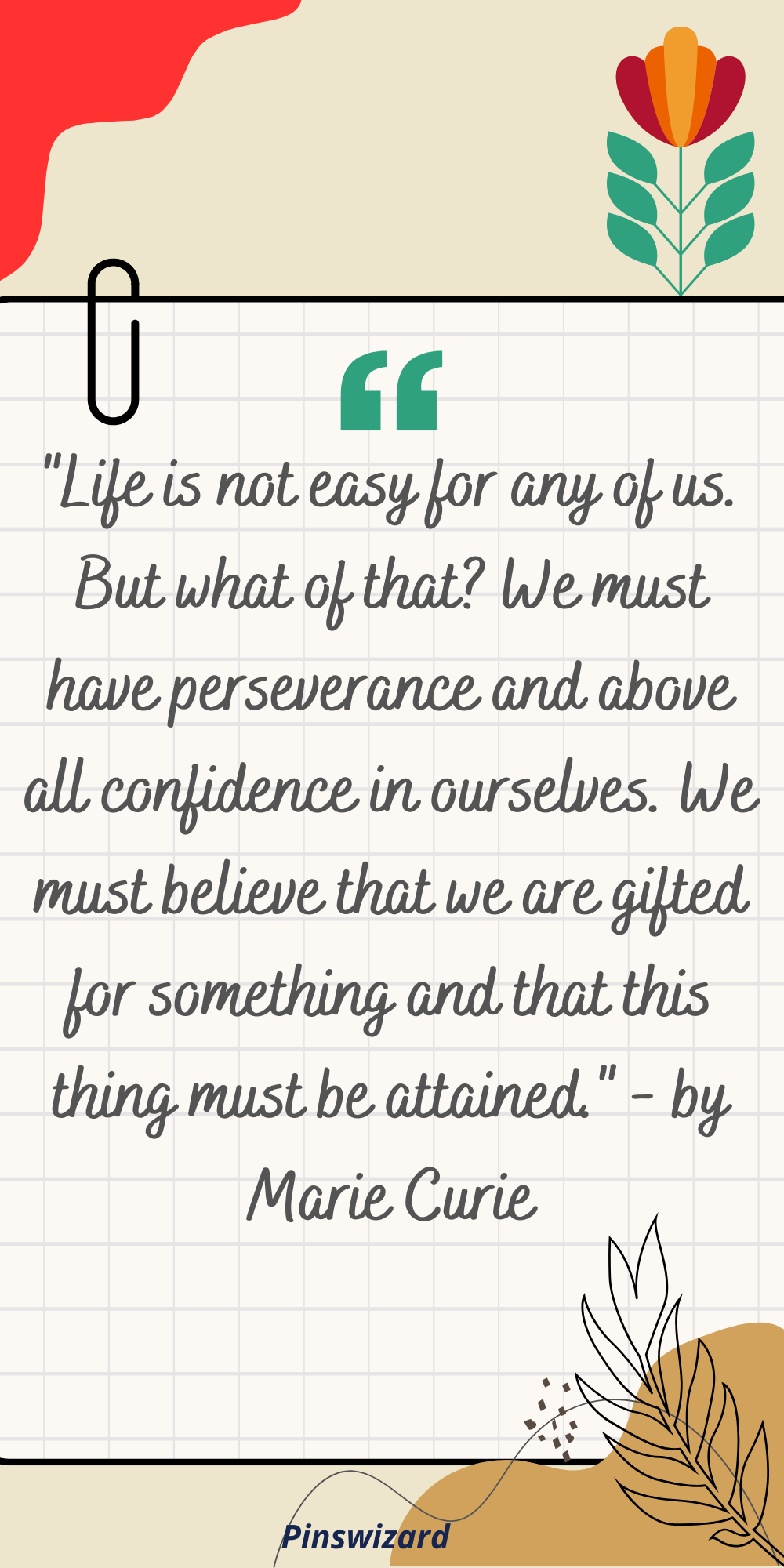 "Life is not easy for any of us. But what of that? We must have perseverance and above all confidence in ourselves. We must believe that we are gifted for something and that this thing must be attained." - by Marie Curie