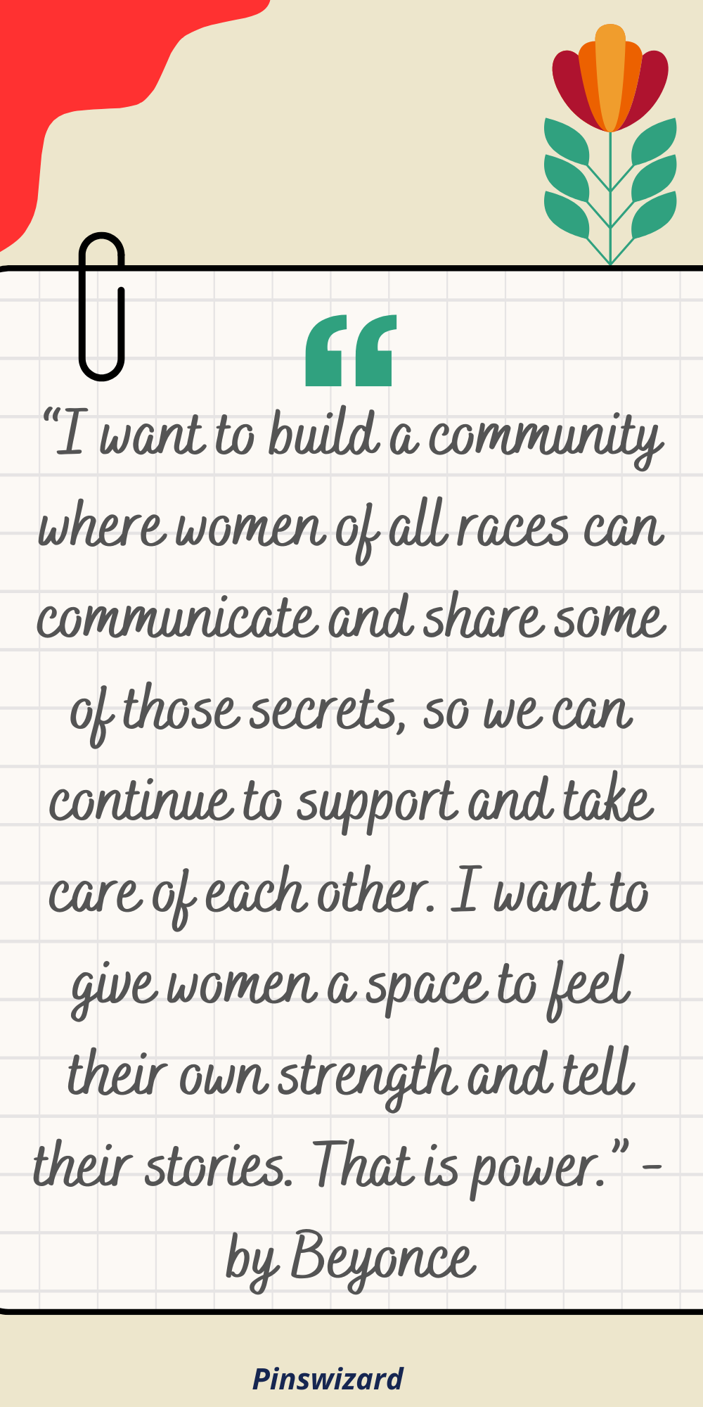 “I want to build a community where women of all races can communicate and share some of those secrets, so we can continue to support and take care of each other. I want to give women a space to feel their own strength and tell their stories. That is power.” - by Beyonce